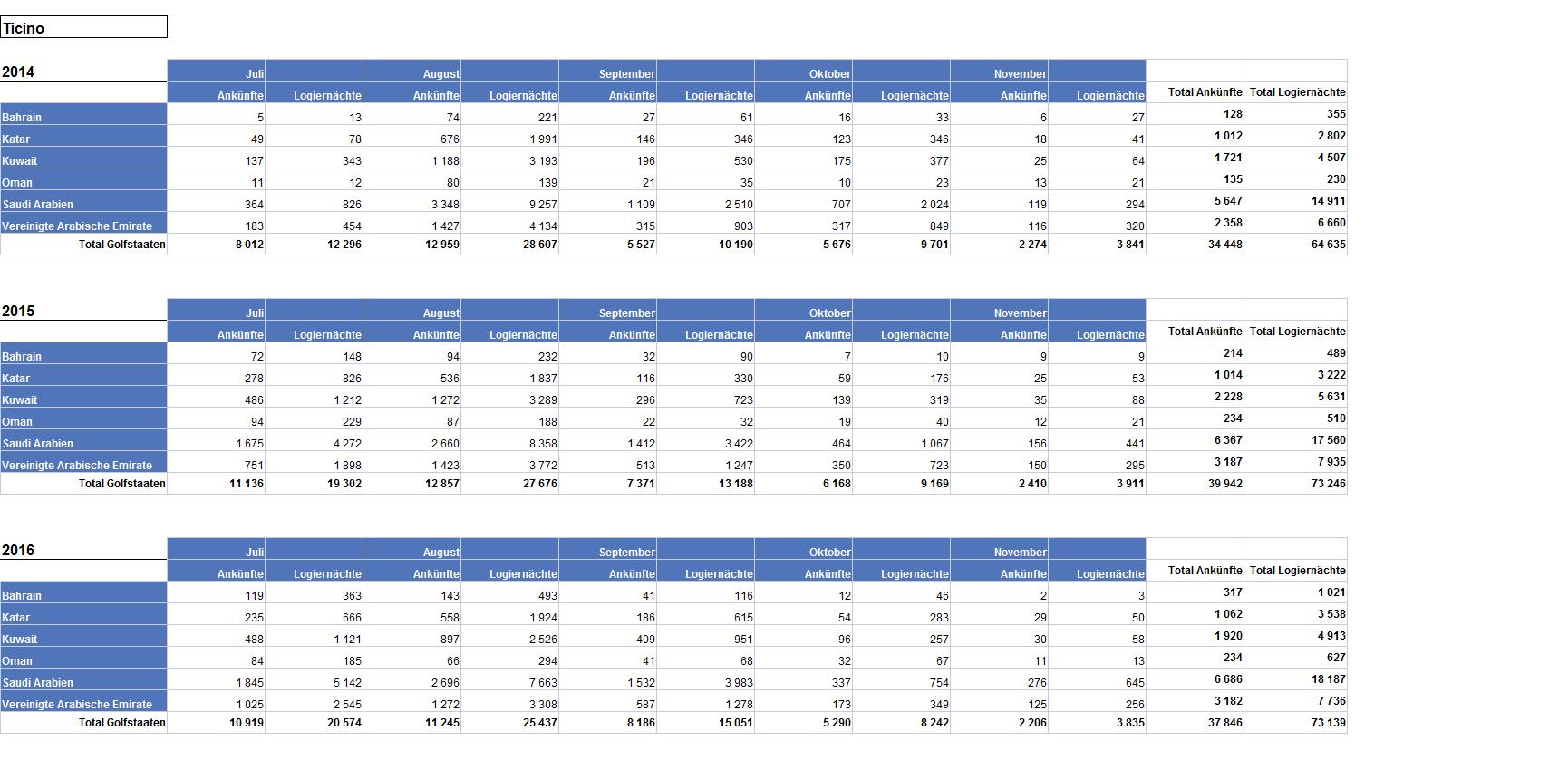 Ankünfte/Logiernächte aus Golfstaaten im Tessin, vorläufige Statistik des BFS, Stand 1. Februar 2017 - zum Download/Vergrössern